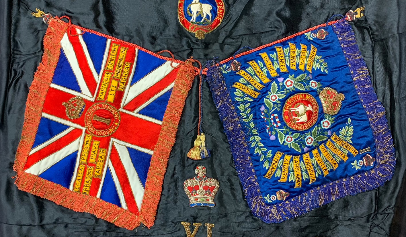 Woolwork embroidery with Royal Warwickshire Regiment banner and emblem, colours, floral garland, drums and bugle.. view more