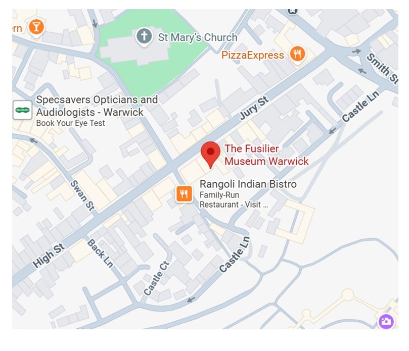 The museum lies in the centre of Warwick and has a large square sign outside presenting the Fusilier Museum Warwick logo and the Royal Warwickshire Regiment insignia.